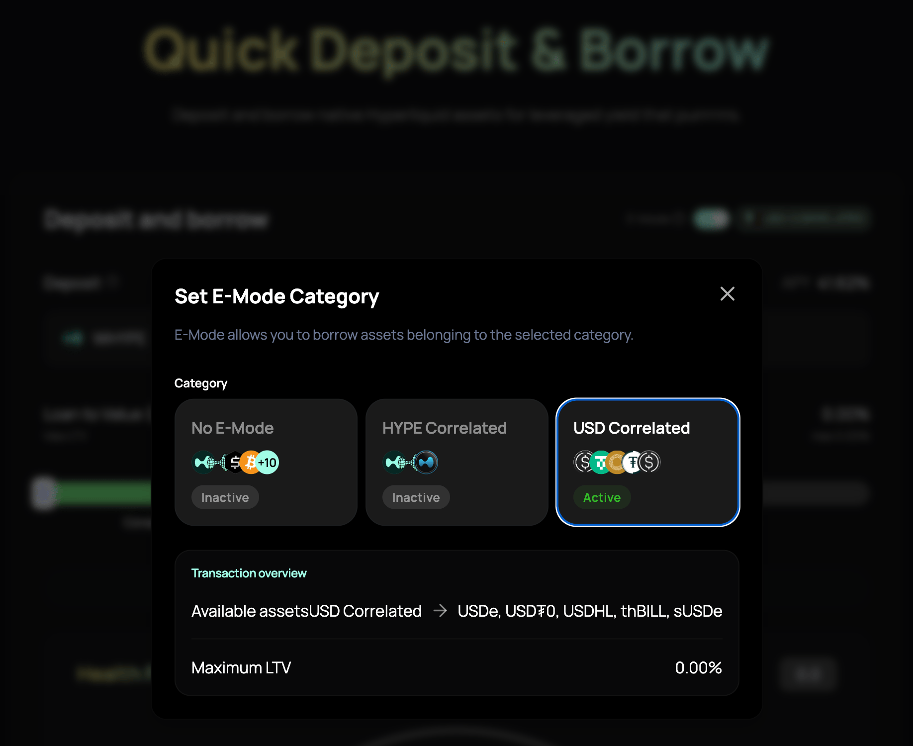 With thBILL now live, HypurrFi is also introducing E-Mode (Efficiency Mode) for dollar-pegged assets on Hyperliquid EVM—a transformative upgrade to DeFi capital efficiency. E-Mode already exists for HYPE-correlated assets HYPE, stHYPE, and kHYPE. Now stablecoin E-Mode brings that robust looping strategy to more assets.